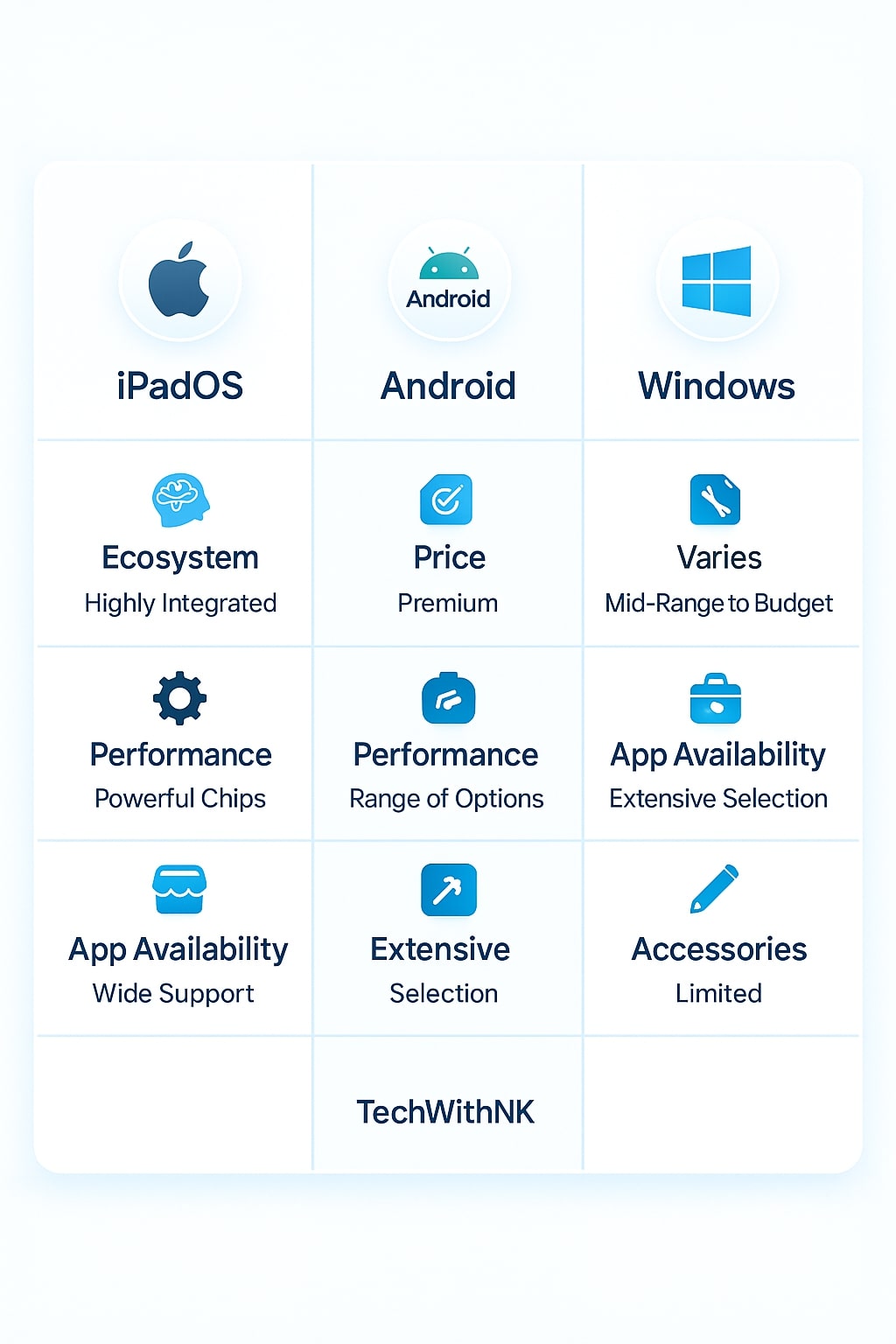 | Apple (iPad) | iPadOS | Best performance, apps | Expensive accessories |